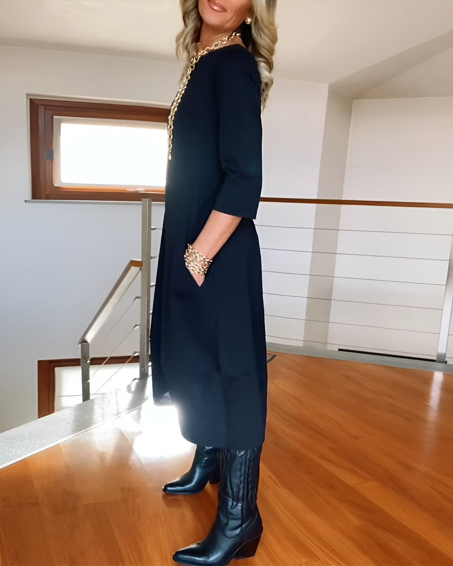 Découvrez la Élodie™ | Robe Élégante Unie, une pièce incontournable qui séduit par sa coupe A-ligne flatteuse, son col rond raffiné et sa longueur midi élégante. Avec ses manches 3/4 et ses poches pratiques, elle allie confort et style pour l’automne et l’hiver.